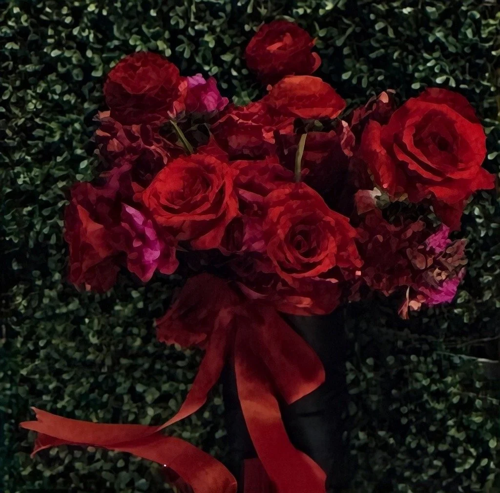 A refined Valentine arrangement featuring lush red roses accented with soft blush and seasonal textural blooms. Designed in Juliet Tan’s signature romantic style, this piece balances richness and softness with layered wrapping and elegant movement.