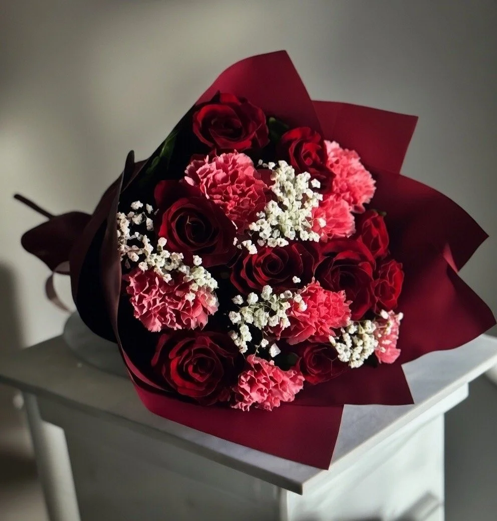 A romantic mixed bouquet featuring premium red roses accented with soft blush blooms and delicate filler flowers. Designed with gentle movement and a balanced, classic Valentine palette, this bouquet feels elegant and heartfelt without being overdone.