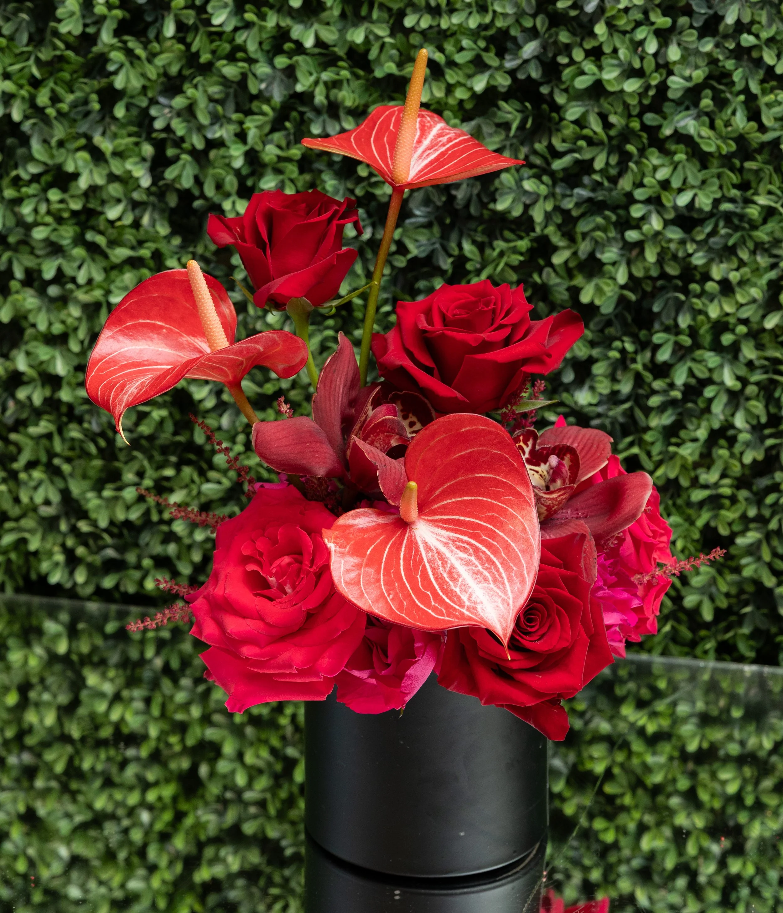 A bold, statement-making Valentine arrangement designed to impress. Featuring premium red roses combined with distinctive seasonal blooms and sculptural elements, this piece has strong presence and modern elegance.