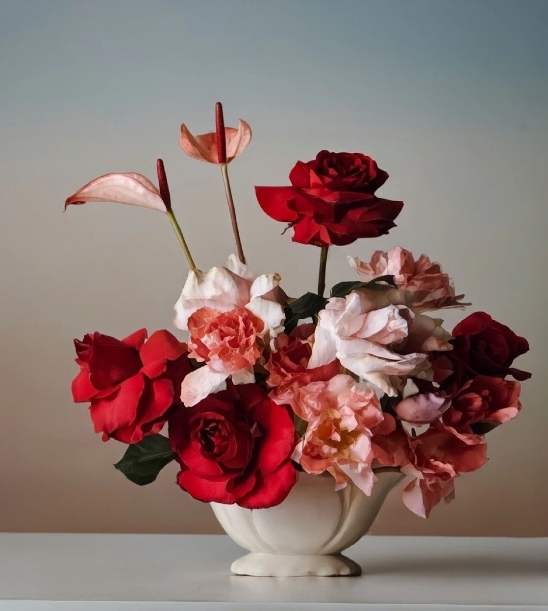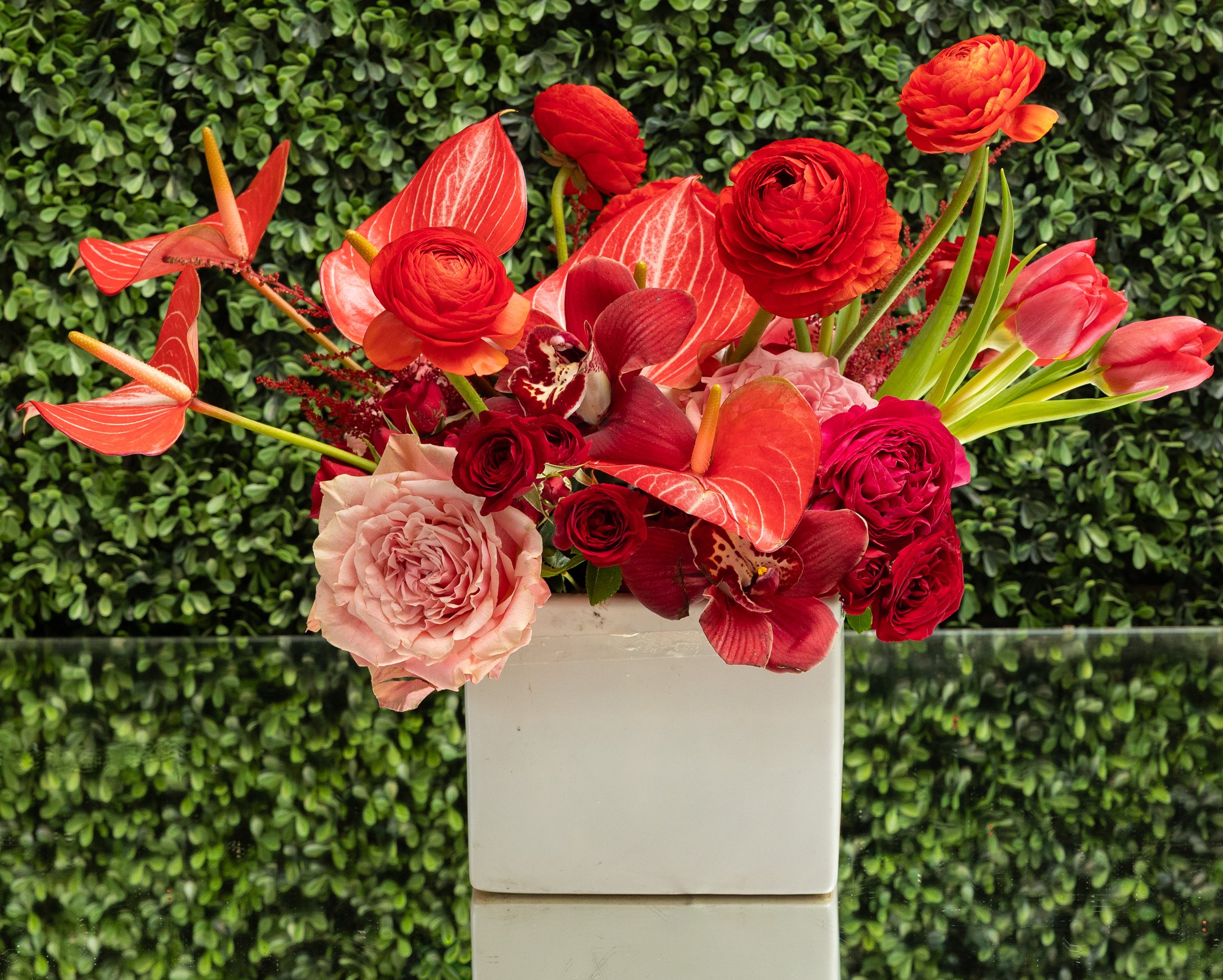 An elevated mixed arrangement featuring premium red roses paired with complementary seasonal blooms in blush and neutral tones. Designed for dimension and visual interest, this piece offers a sophisticated balance of romance and artistry.